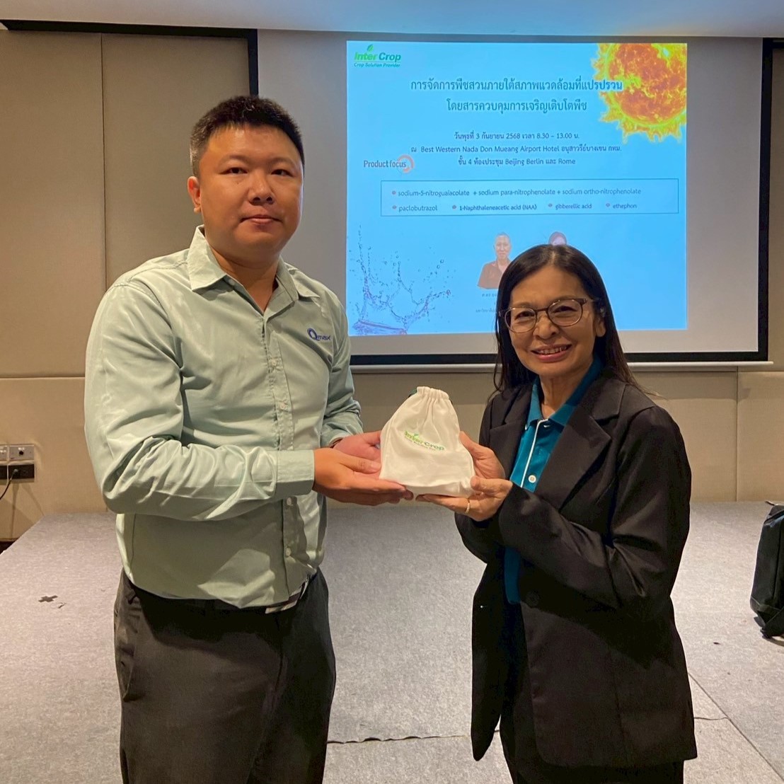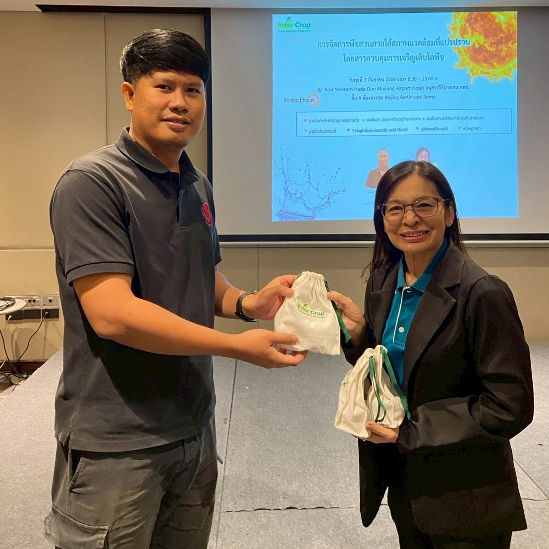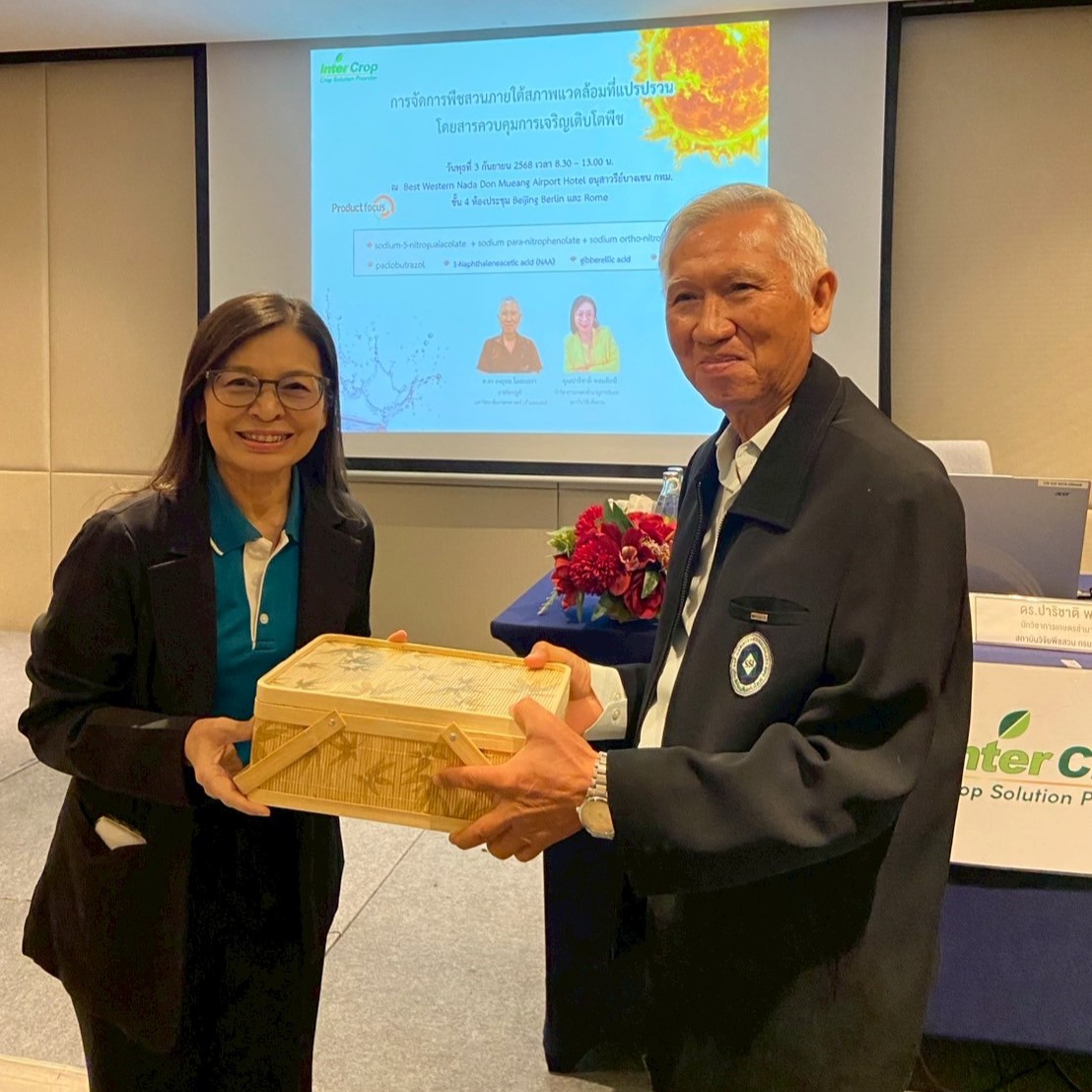 As climate volatility increasingly impacts global agriculture, projections indicate that within the next five years, global temperatures are likely to break historical records. This trend poses significant challenges for farmers, requiring them to adopt new approaches to manage crops under extreme and unpredictable conditions. In response, Inter Crop Group organized a seminar on “Managing Horticultural Crops amid Environmental Crises with Plant Growth Regulators” for its business partners on September 3, 2025, at Best Western Nada Don Mueang Airport Hotel. The seminar featured three distinguished speakers, aiming to equip growers of key horticultural crops—such as durian and mango—with practical knowledge and techniques to maintain yield and crop resilience, even under unavoidable environmental stress, through the proper, timely, and effective use of Plant Growth Regulators (PGRs).